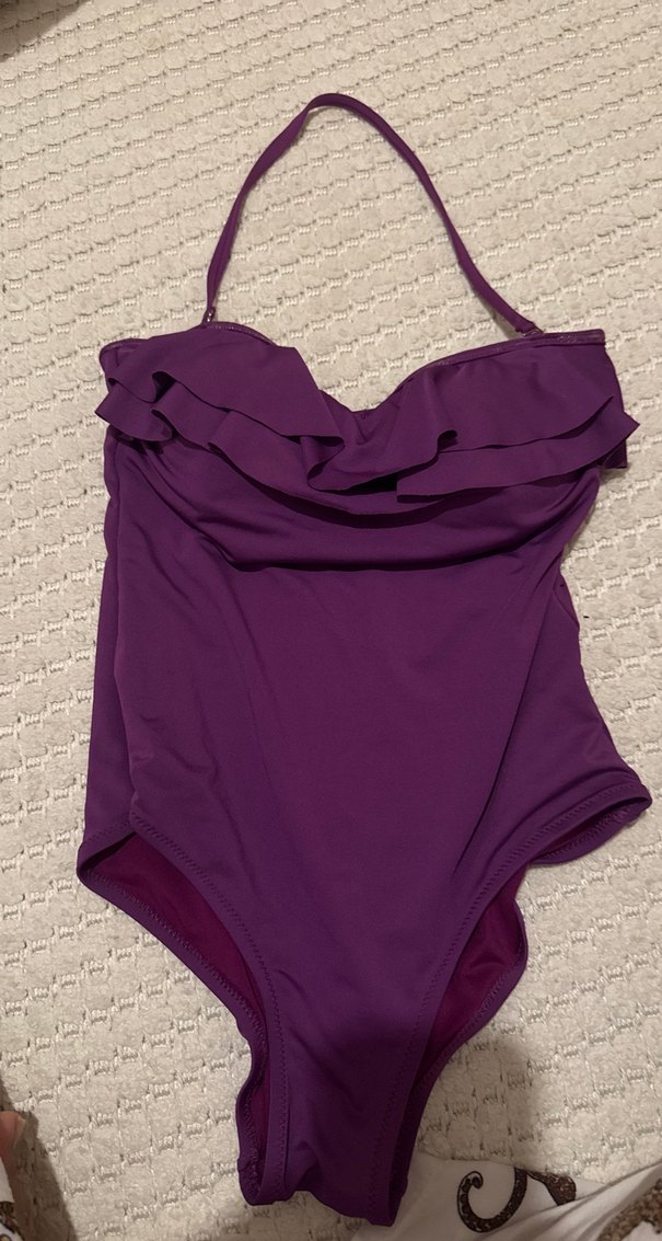 Mor renk, fırfırlı ve askılı tasarıma sahip, vücuda oturan kadın mayo. Cesur ve minimalist plaj stili için uygun.