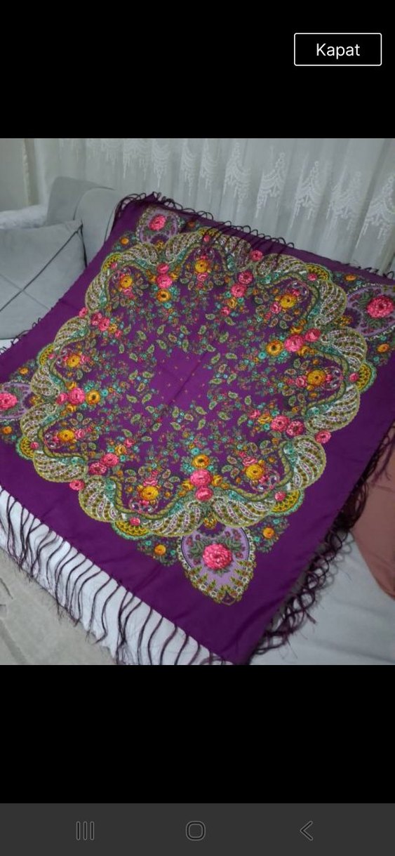 püsküllerinden bazısı eksik bilginiz olsun.Mor renginde, canlı çiçek desenleri ve fırfırlı kenarları olan sentetik kumaştan bohem tarzında kadın eşarbı