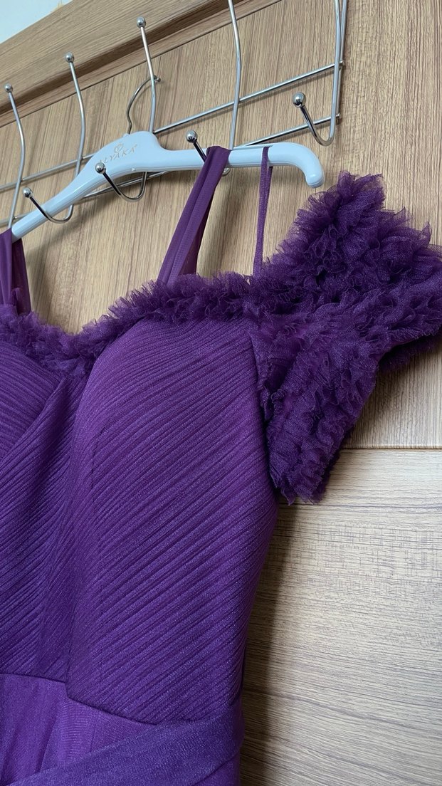 Mor renkli, kayık yakalı, yırtmaçlı abiye elbise.