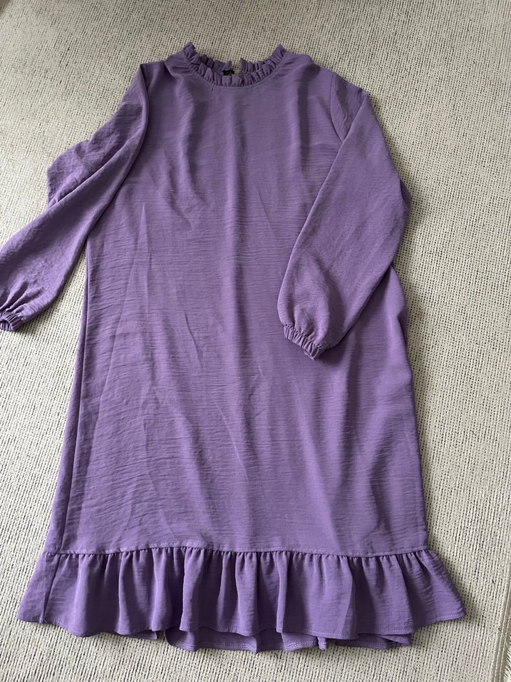 Mor renkli tunik, rahat kesim, uzun kollu ve yuvarlak yaka. , yakada ve etekte fırfır detaylarıyla günlük kullanıma uygun rahat bir model.