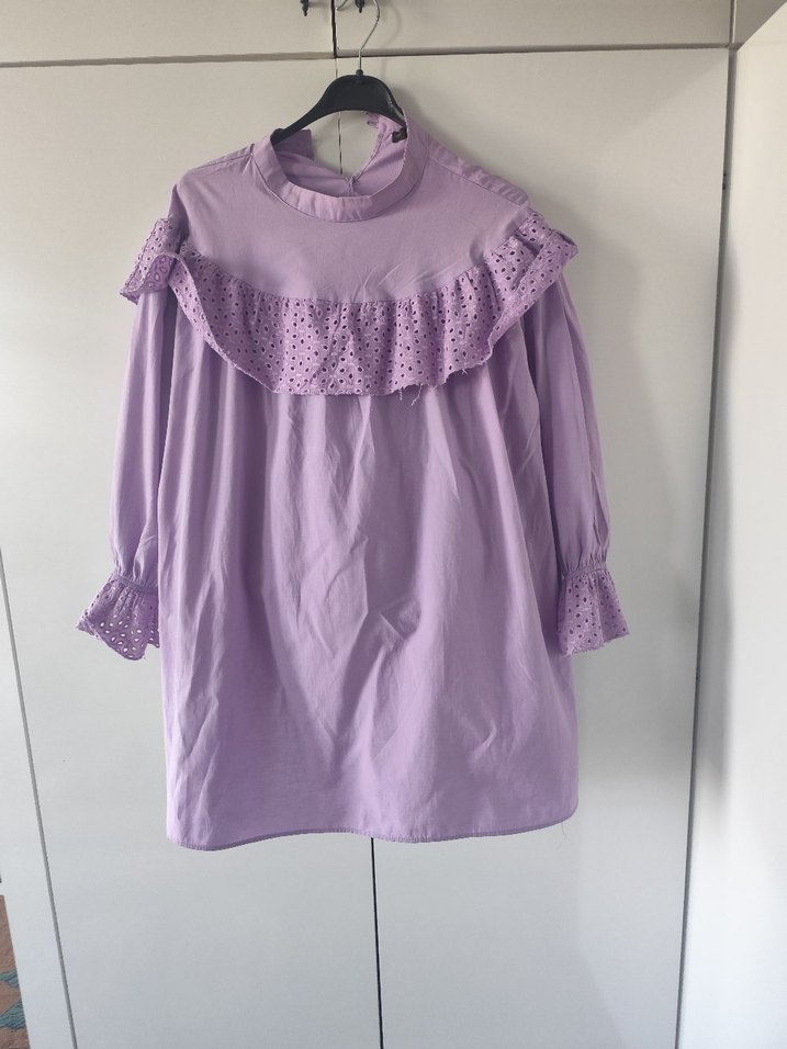 Yüksek yakalı, uzun kollu ve fırfırlı işlemeli detaylara sahip, rahat kesim . Yumuşak keten kumaştan, pastel mor renkte bohem ve retro tarzda.