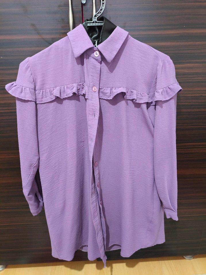 Mor renkli, uzun kollu, yakalı ve göğüs kısmında fırfır detaylı bol kesim gömlek. Yumuşak keten kumaştan, rahat sokak stili için uygun.