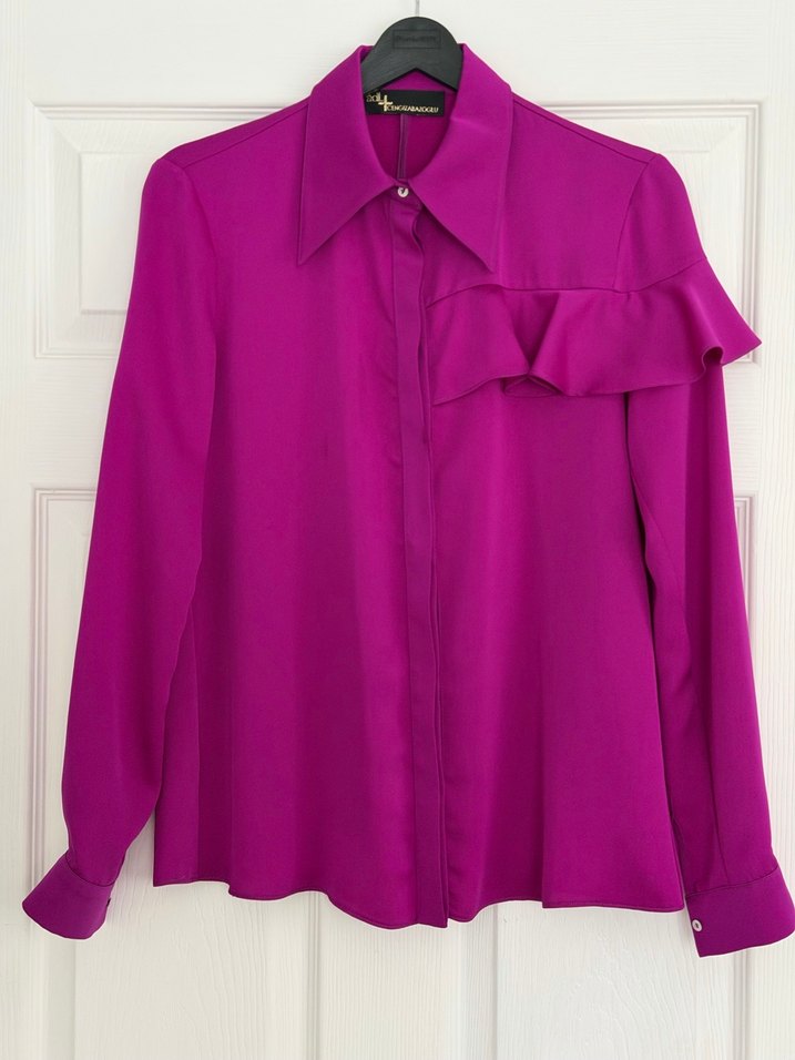 Mor renkli, ipeksi dokulu, yakalı ve uzun kollu, bol kesim kadın gömlek. Tek tarafında fırfır detayı bulunur, parlak yüzeye sahiptir.
