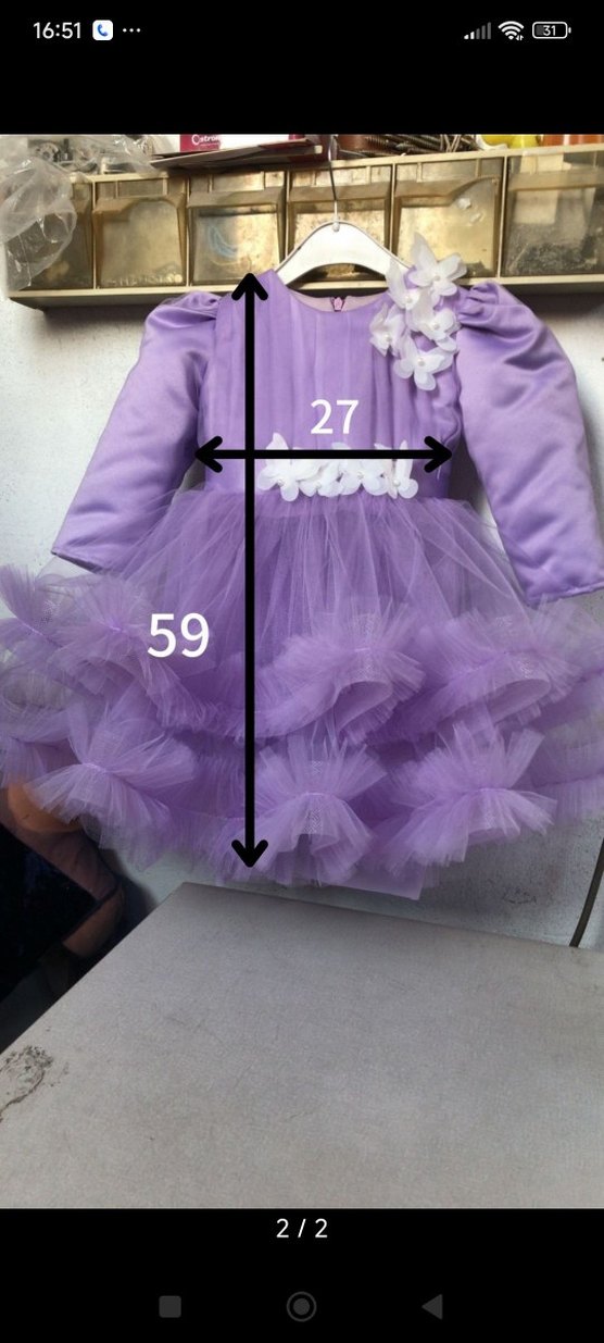 Mor renkli, uzun kollu, tekne yaka ve fırfırlı katmanlara sahip kız çocuk elbisesi. Yumuşak sentetik kumaştan, çiçek desenli. ölçüleri mevcut