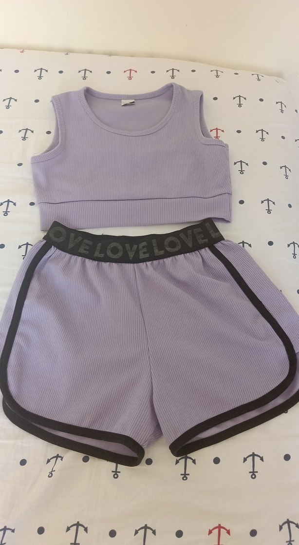 Mor pastel renkte, fit kesim crop top ve şort takımı. Şortta 'LOVE' yazılı siyah bel bandı ve siyah şerit detayları bulunur. Rahat ve şık bir sokak stili takımı.