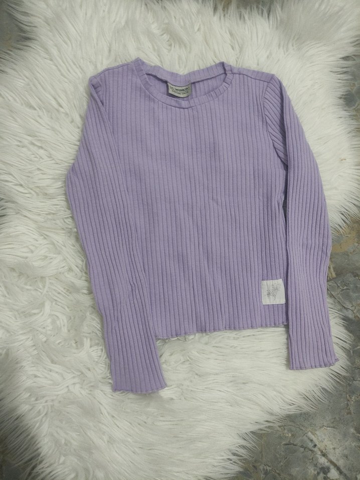 Fitilli, uzun kollu, mor renkte kadın kazak. Yuvarlak yaka ve yumuşak örme kumaştan, gündelik kullanıma uygun rahat bir model.