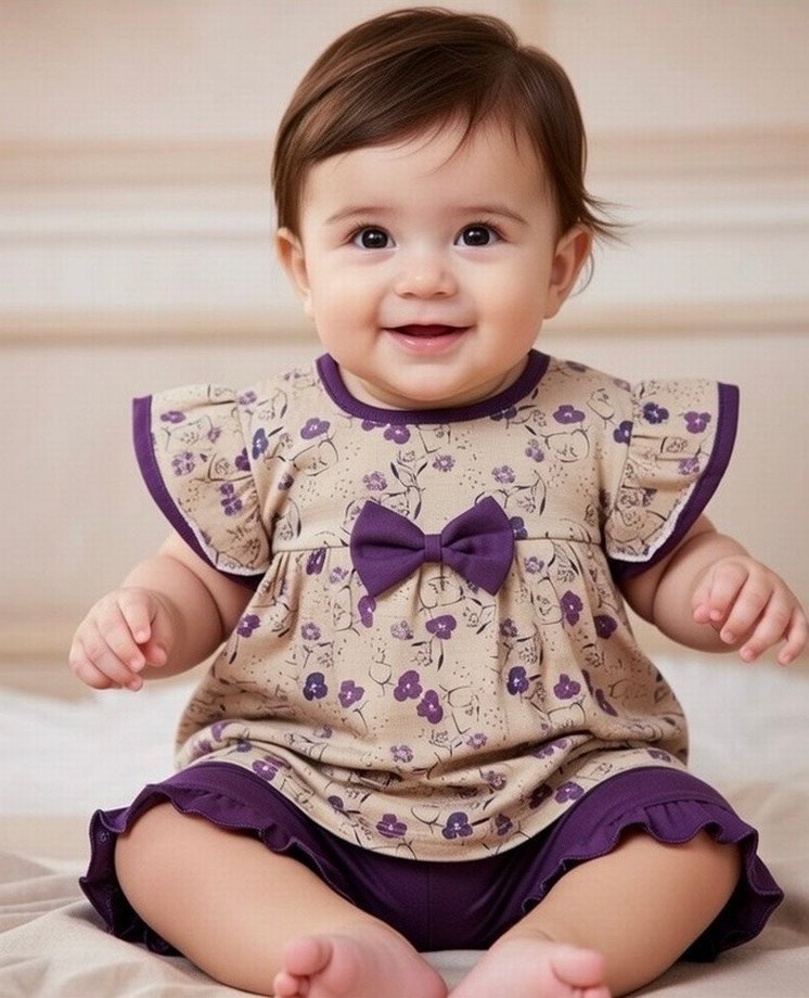 Mor detaylı, fiyonklu ve fırfırlı kısa kollu üst ile fırfırlı şortlu bebek kız takımı. Üst, renkli batik çiçek desenlidir.