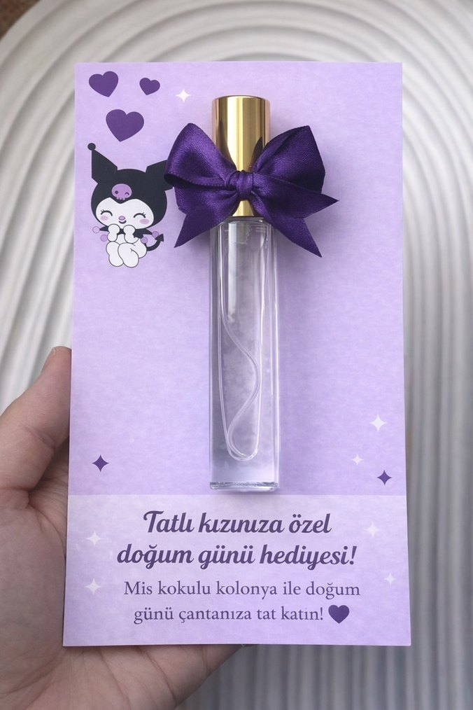 Mor fiyonkla süslenmiş mis kokulu kolonya, doğum günü çantanıza tat katmak için özel olarak tasarlanmıştır. Pastel mor zeminde sevimli bir karakterle sunulur.