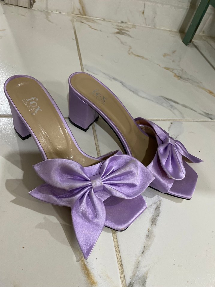 İpek gibi mor, blok topuklu kadın terlikler büyük fiyonk detayına sahiptir. Pastel tonlarda, bağlama desenli, düğünler için çağdaş Paris tarzı şıklık sunar. 1 defa giyildi ihtiyaç fazlası