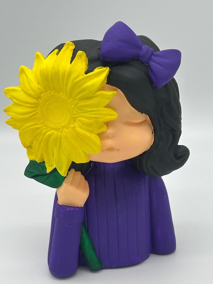 Mor fiyonk ve saçları olan kız figürü, yüzünü kapatan büyük sarı ayçiçeği tutuyor. Üzerinde mor kazak var.
