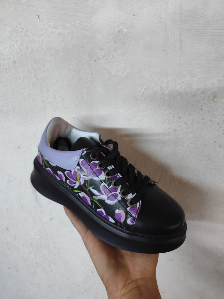Mor floral desenli, stiletto topuklu ve bağcıklı spor ayakkabı, günlük sokak stili için kauçuk malzemeden üretilmiştir.