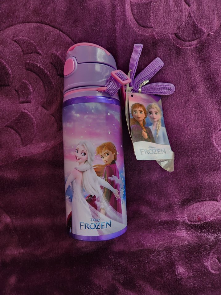 Mor renkli, Frozen temalı çocuk termos matara, kolay taşınması için askı ipi ile birlikte gelir.