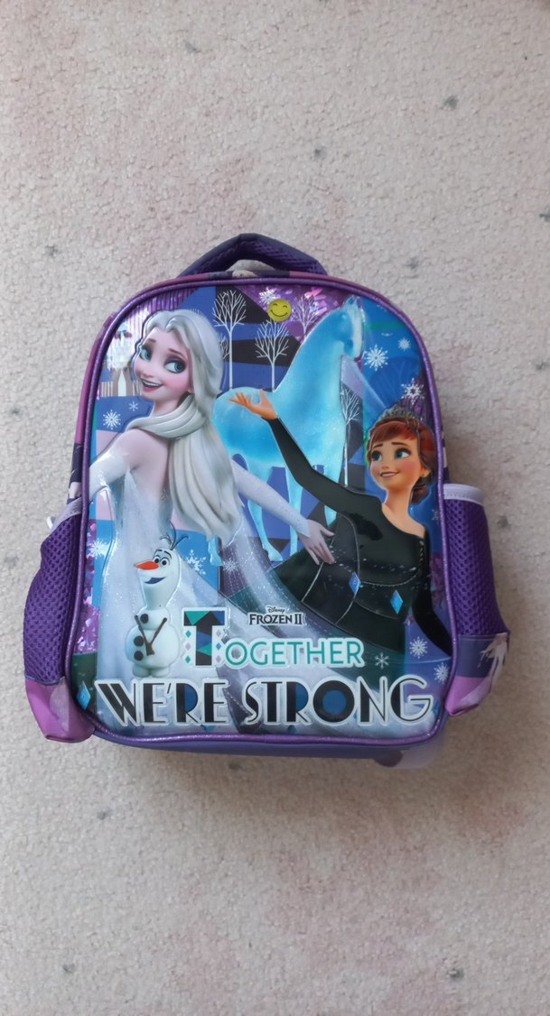 Mor renkli, Frozen II karakterli çocuk okul çantası. "WE'RE STRONG" yazısı ve yanlarda file cepler bulunur. ❄️