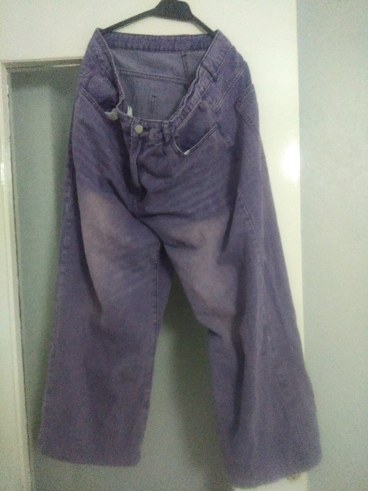 Mor ve gri tonlarında, geniş kesim midi kot pantolon. Günlük rahat ve şık bir görünüm sağlar.
