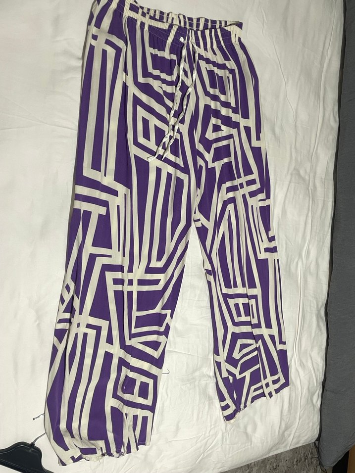 100cm boy 60-80 kg için uygun Mor geometrik desenli, pileli, uzun ve salaş kesim kadın pantolon. Sentetik kumaştan, günlük ve athleisure tarzına uygun rahat bir model.