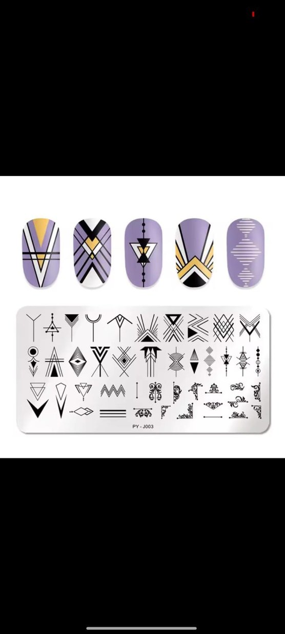Mor renkli tırnak süsleme seti, PY-J003 kodlu geometrik desenler içerir. Farklı detaylı tasarımlar sunar.