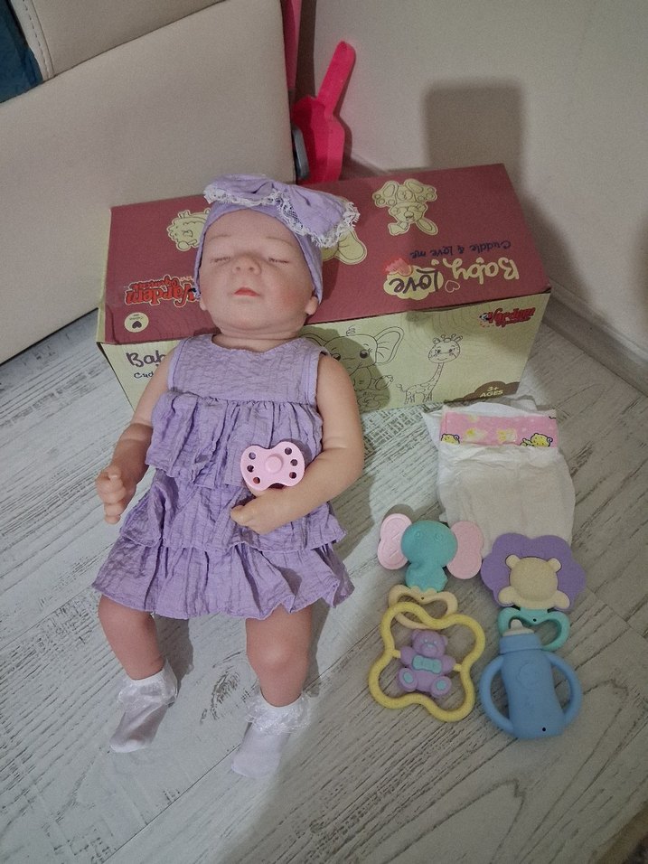 Fırfırlı elbiseli ve uyumlu bantlı pastel mor bebek oyuncağı, emzik ve çorap gibi bebek aksesuarları ile birlikte. gözleri kapalı mor elbiseli gerçekçi bebek. kızım gözleri kapalı gerçekçi bebek istediği için aldık ama artık istemiyormuş. fazlalıktan satılık. hiç oynanmadı. bezini taktık ama sağlam durumda. patçaları aksesuarları tam ve temiz. #gerçekçibebek #rebornbebek #gözlerikapalıgerçekçibebek