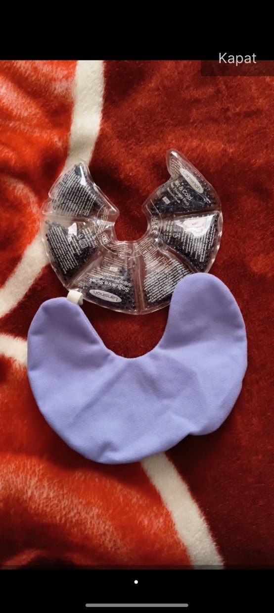 Mor göğüs pedi ve gri jel soğuk kompres içeren rahatlatıcı ürün.