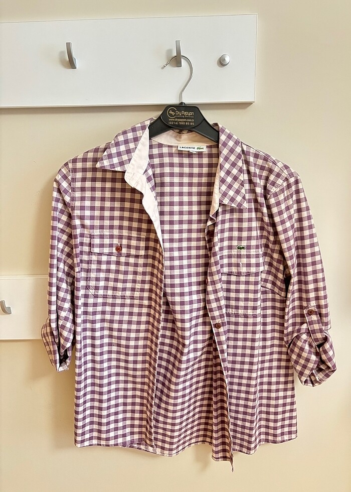 Çok az kullanıldı, defosu yok, 0 pamuk, mor renkli, kareli, uzun kollu, orijinal lacoste gömlek