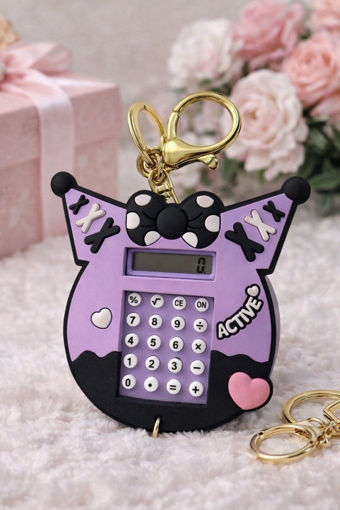 Mor gotik tarzda, küçük hesap makinesi, boncuklu detaylar ve fiyonk tasarımı bulunan anahtarlık. Altın renkli klips ve renkli detaylar içerir. ️