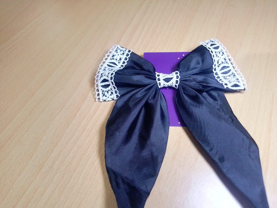 Sentetik kumaştan yapılmış, beyaz dantel detaylı koyu mor gotik stil fiyonk saç aksesuarı, şık bir görünüm için uygun.