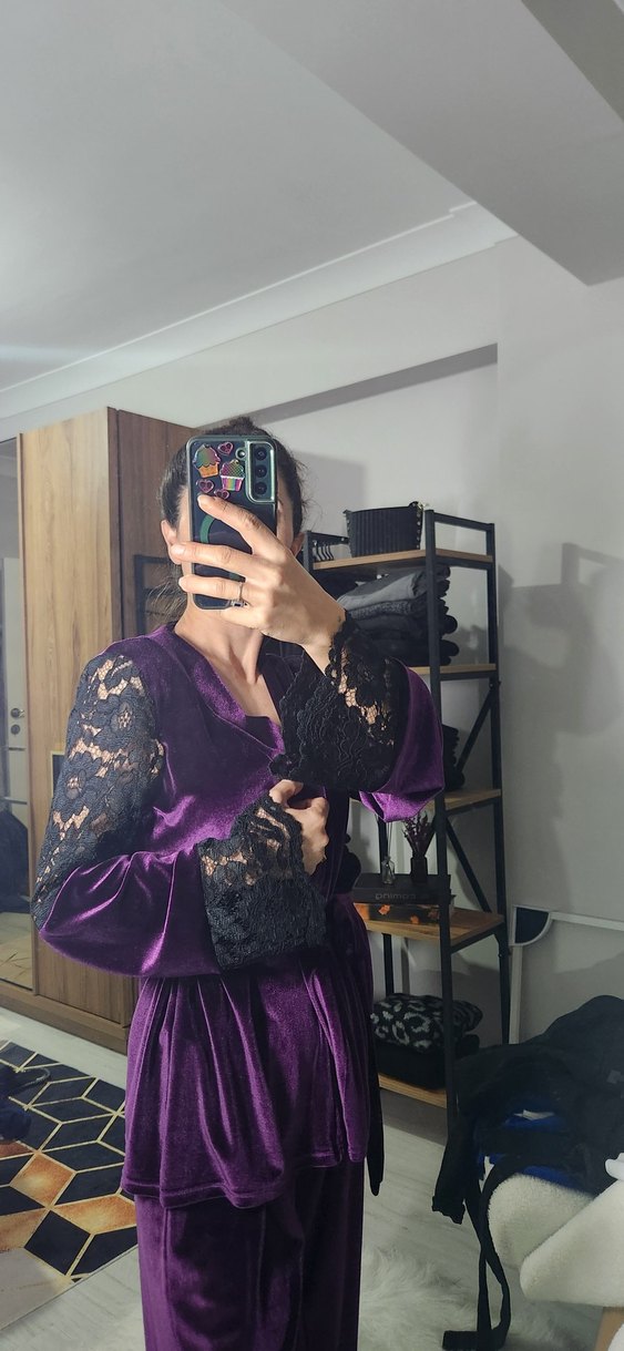 Uzun kollu, siyah dantel detaylı mor gotik sabahlık. Midi boy ve bol kesim, rahat ve şık bir görünüm sunar. 1 kez giyildi sorunsuz sıfır gibi.s m uyumlu