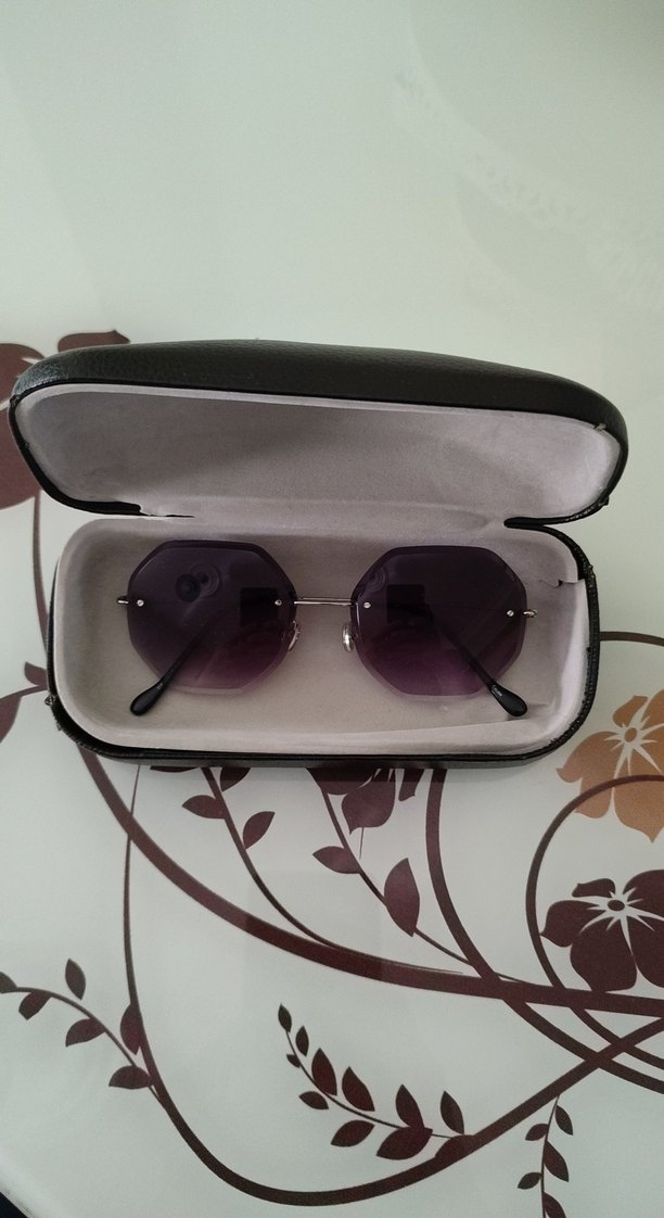 Koyu mor renkte, gotik tarzda, tokalı kadın güneş gözlüğü. Retro bohem havası ve koruyucu kutu ile birlikte. Koruyucu kutuda hasar var resimde belirtildi.