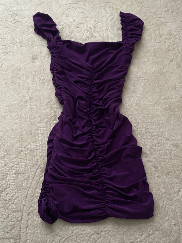 Drapeli, straplez yaka ve kolsuz mor elbise, gotik tarzda romantik akşamlar için uygun. Midi boy ve vücuda oturan kesime sahip. kizlar Bedeni Lf fakat s bedenede cok rahat oluyor esneyen bir kumaşa sahip 2 kere giymişimdir sadece