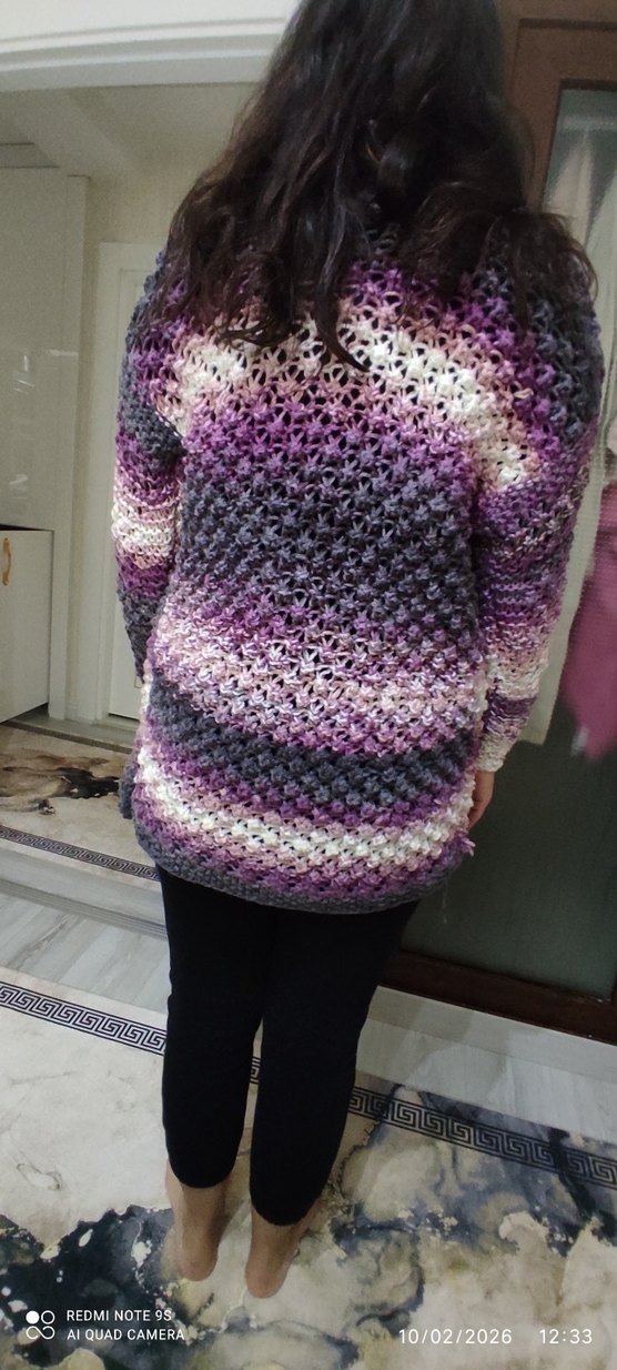 Mor ve gri tonlarında bağlama desenli, boğazlı ve uzun kollu örme kadın hırka. Rahat kesimi ve midi boyu ile günlük kullanıma uygundur.