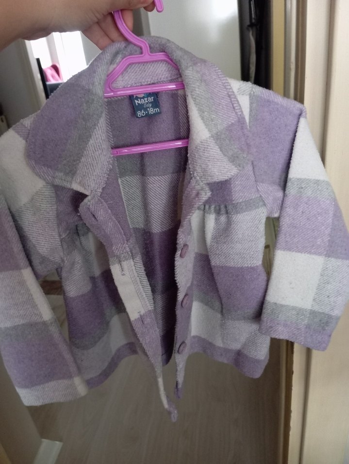 Mor ve gri kareli, düğmeli, yumuşak ve sıcak kumaştan yapılmış bol kesim kız çocuk ceketi.