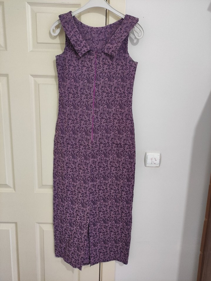 Koyu mor uzun elbise, fermuarlı ve vücuda oturan kesime sahip. Askısız ve kolsuz, çağdaş minimalist tarzda tasarlanmıştır.