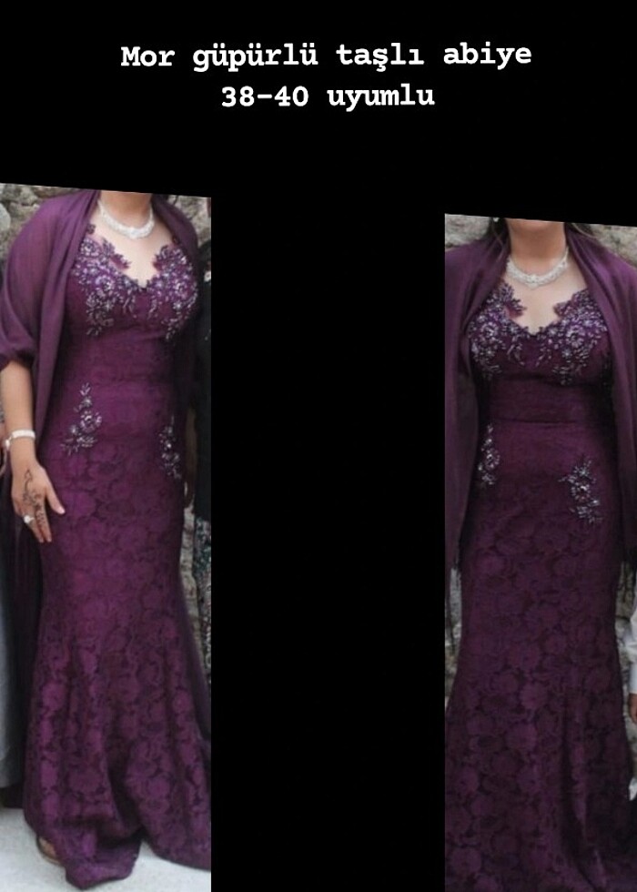 38 40 beden uyumlu boncuk taş işlemeli güpür mor abiye elbise