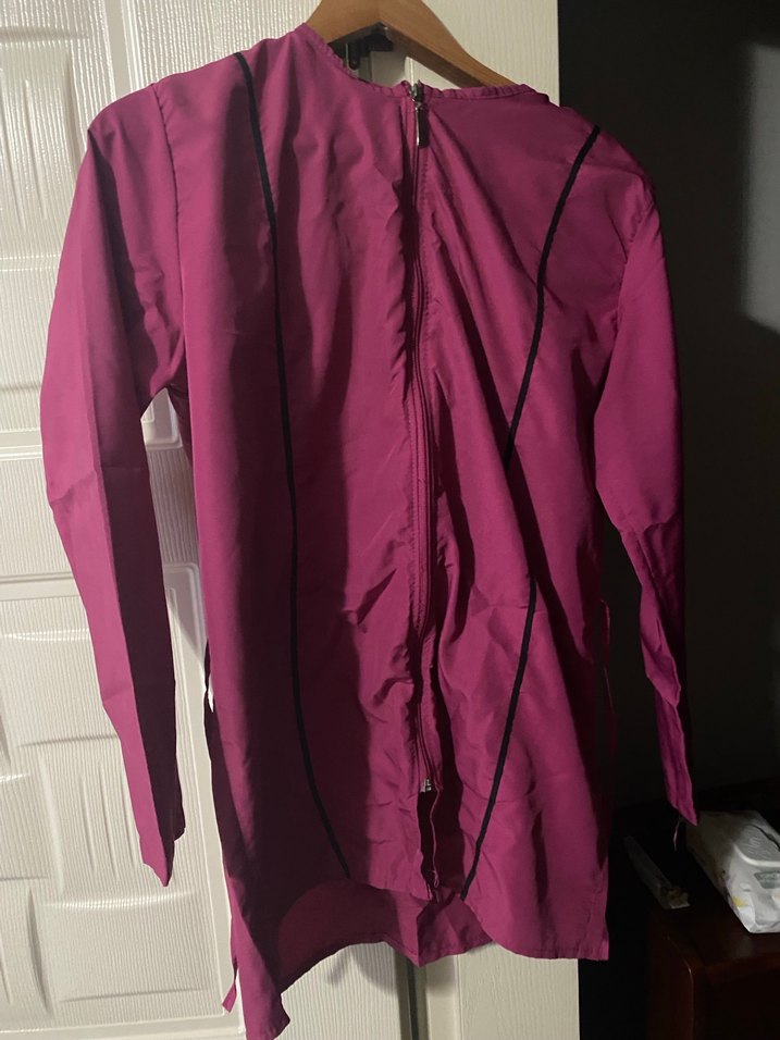 Fermuarlı önü, yüksek yakası ve uzun kollu, mor renkte midi uzunlukta, desenli haşema.