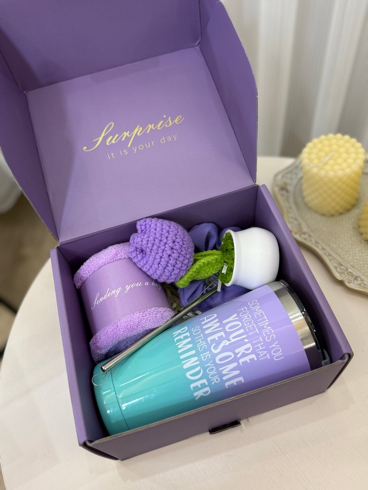 Pastel mor hediye kutusu, havlu, tığ işi çiçek ,havlu, saç tokasi ve ilham verici mesajlı termos içerir. Kutunun kapağında 'Surprise it is your day' yazıyor.