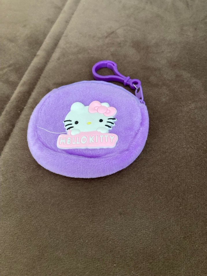 Yumuşak dokulu, mor renkli ve Hello Kitty desenli, klipsli kedi aksesuarı çantası.