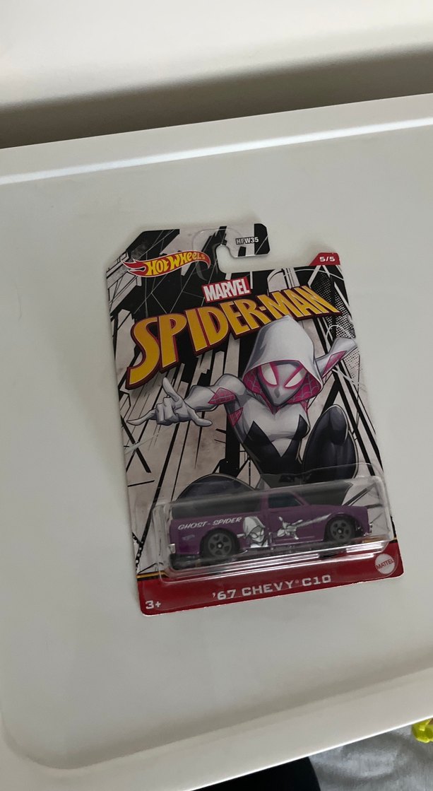 Koyu mor renkte Hot Wheels oyuncak araba, '67 Chevy C10 tasarımı ve Marvel Spider-Man grafiklerine sahip. Paket üzerinde Spider-Man karakter görseli bulunur. ️