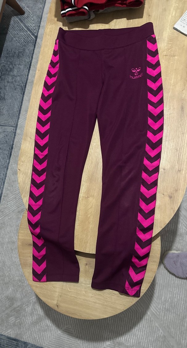 Hummel markalı, elastik bel bantlı, yanları pembe zikzak desenli mor kadın spor taytı. Rahat ve şık spor kombinler için ideal. ♀️