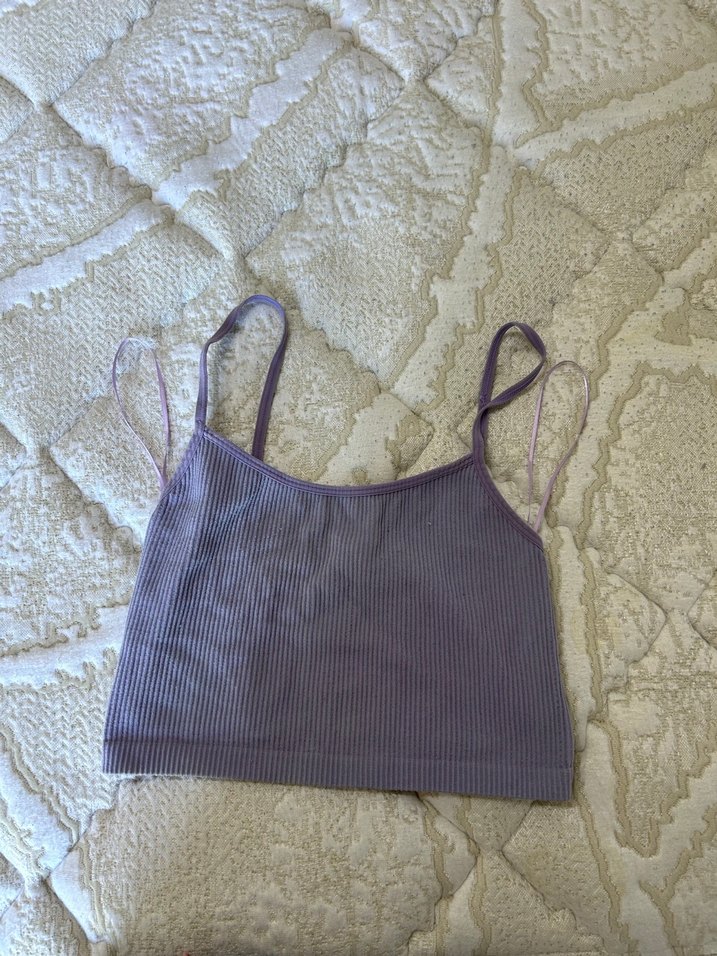 Mor pastel renkli, ince askılı ve vücuda oturan crop top. Yumuşak sentetik kumaştan, günlük sokak stili için uygun.