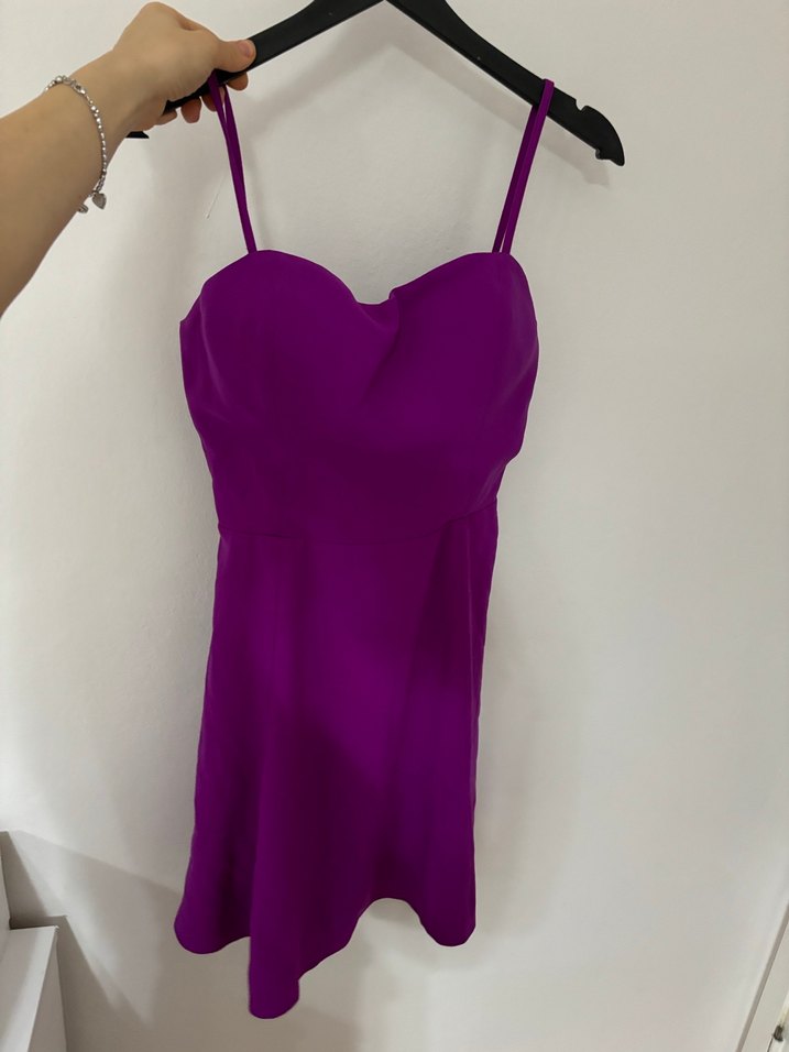 İnce askılı, straplez yaka ve drapeli detaylara sahip mor, vücuda oturan elbise. Romantik akşamlar için uygundur.