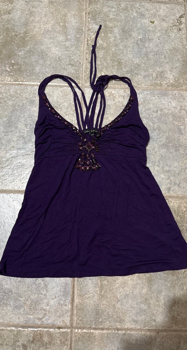 Mor renkli, ip askılı ve boncuk detaylı, saten dokulu, oturan kesim kadın bluz. Midi boyda, gotik ve cesur tarzlar için uygun.
