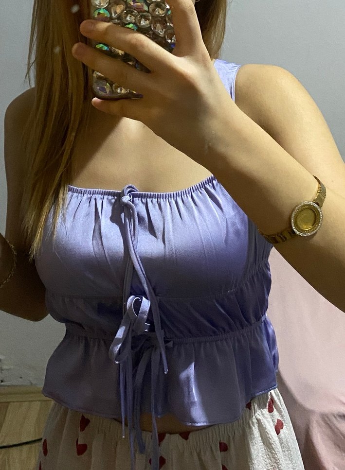 Mor ip askılı, düğmeli ve fitted kesim kadın bluz. İpeksi kumaş ve pastel tie-dye deseniyle günlük rahat kullanıma uygundur.