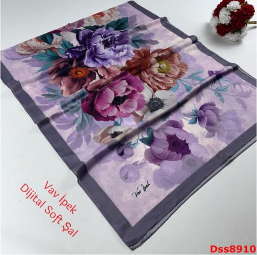 Koyu mor renkte, ipek görünümlü, çiçek desenli ve drapeli bohem tarzda fular. Üzerinde "Vav ipek" yazısı bulunmaktadır.