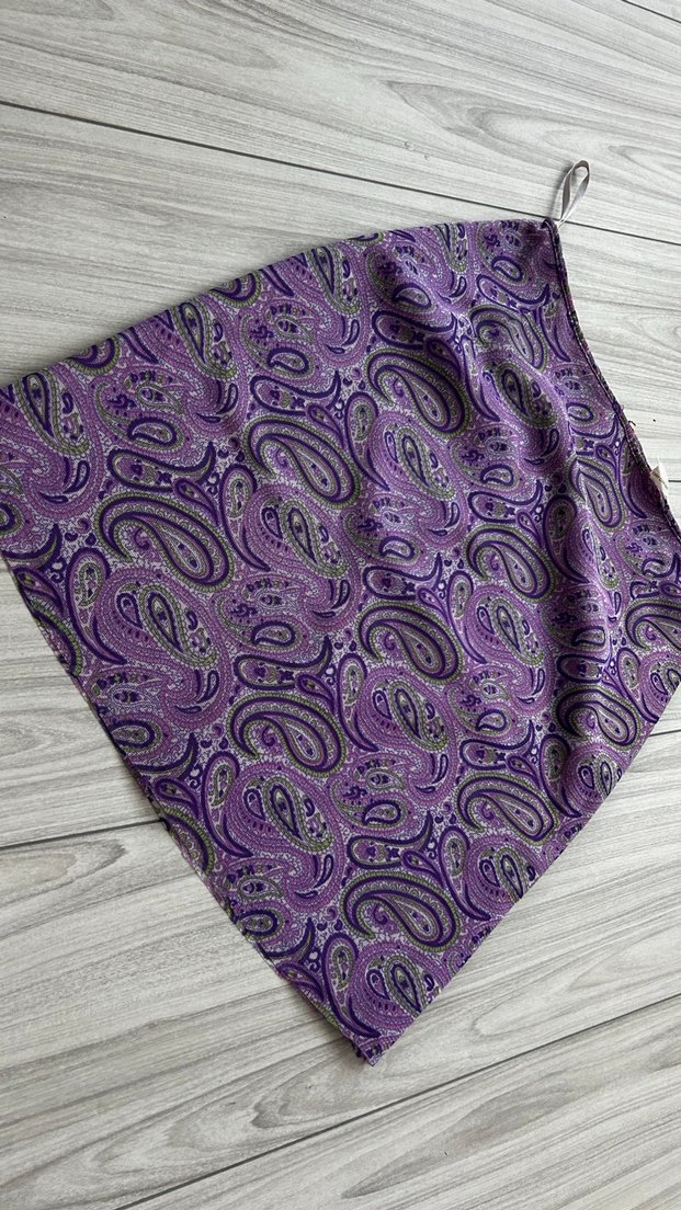 Mor parlak ipek görünümlü kumaştan, mini kesim ve desenli bohem tarzda, mini boyda etek. Günlük ve gece kullanıma uygundur.