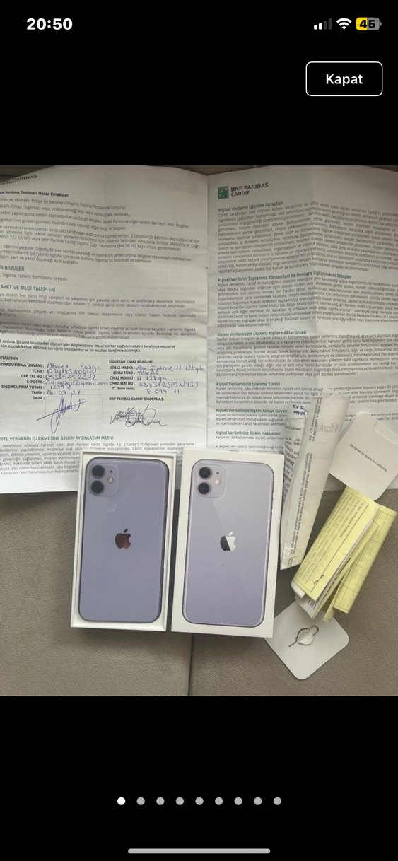 128GB depolama kapasiteli mor iPhone 11, orijinal kutusunda aksesuarları ve belgeleriyle birlikte. Cihazın arkasında çift kamera ve gri Apple logosu bulunur. Ömür boyu cam koruma garantisi var