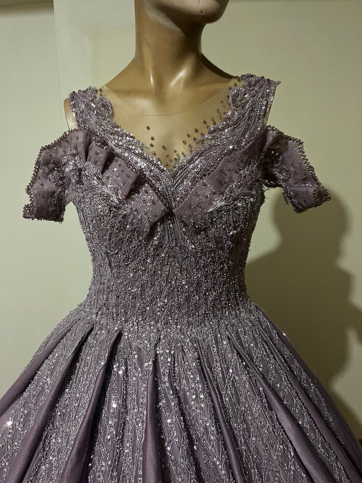 Mor, işlemeli ve boncuk detaylı V yakalı, kolsuz, uzun ve vücuda oturan abiye. Parlak ve gösterişli modern klasik tarzda, düğün için uygundur. ✨ ipi yok