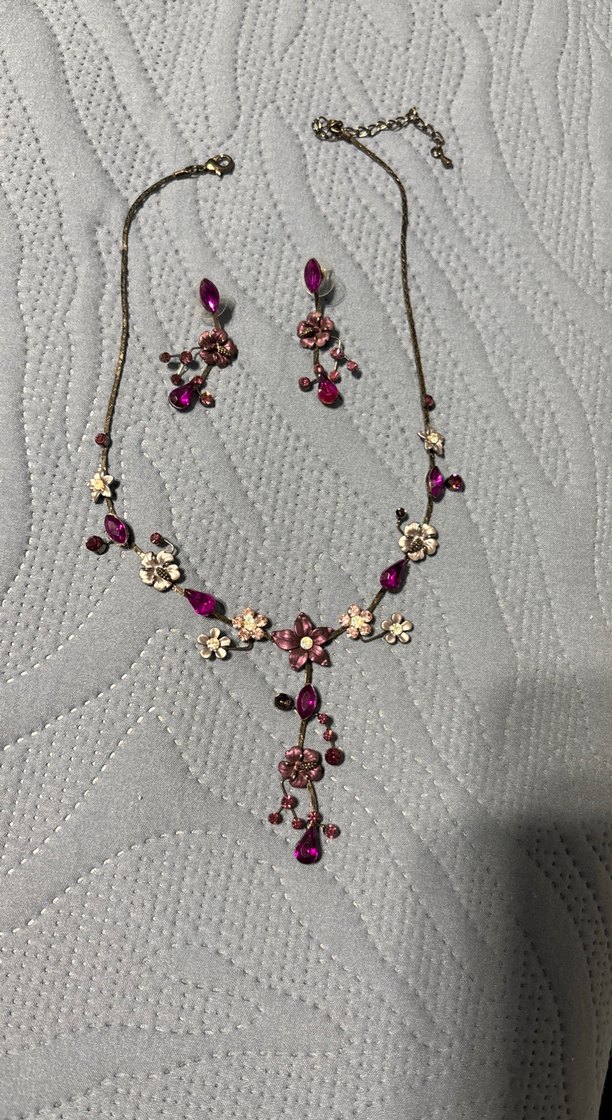 Bohem tarzı mor boncuklar ve işlemeli çiçek detaylarına sahip kadın takı seti, düğünler için uygun.