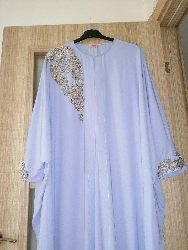 İpek gibi kumaştan, drapeli ve işlemeli detaylara sahip, mor pastel tonlarında, uzun ve kolsuz, yuvarlak yakalı bol kesim Abaya 46,48,50,52 beden standartdır rahatlıkla olur. Sadece bi kez kullanıldı kuru temizleme yapılıp gönderilecektir.