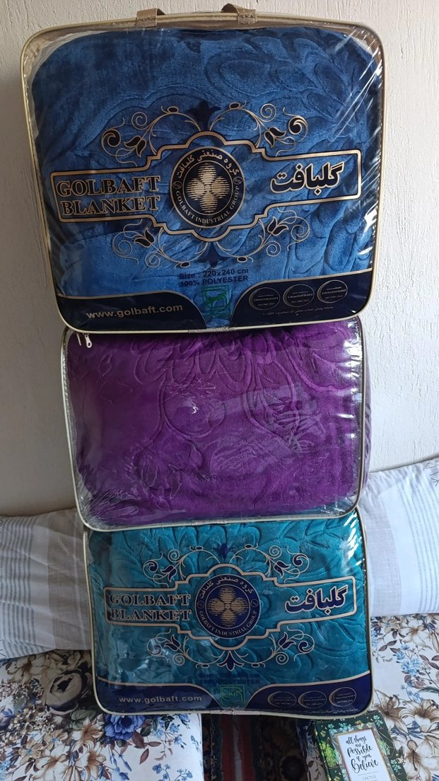 Mor renkli, işlemeli Golbaft markalı battaniye, yumuşak dokusu ve şık tasarımıyla dikkat çekiyor. Paket üzerinde marka ve ürün bilgileri yer alır. ️