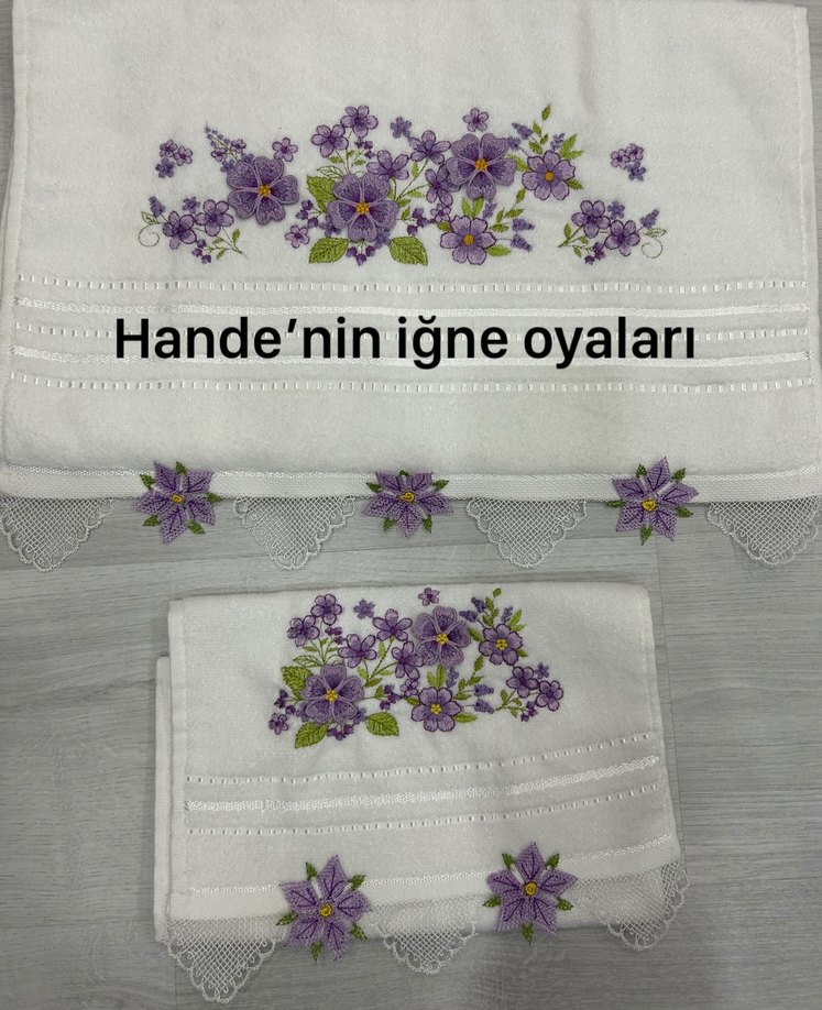 Mor işlemeli çiçek desenleri ve gri dantellerle süslenmiş klasik tarzda havlu seti. "Hande'nin iğne oyaları" yazılı ince işçilik içerir.