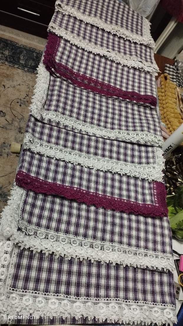 Koyu mor renkte, kareli desenli ve işlemeli dantel detaylı geleneksel tarzda masa örtüsü. bir metreye bir metre